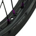 In dieser Sondervariante mit lila CNC-Naben, lila Speichennippeln, schwarzen Speichen und schwarzen 7075-Alu-Felgenringen bringt der Laufradsatz nicht nur Robustheit ins Gelände, sondern auch Farbe an dein Bike.